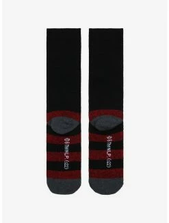 Cold feet? What a nightmare! Grab these black crew socks featuring a graphic of Freddy Krueger with his name above and red stripes on the foot.