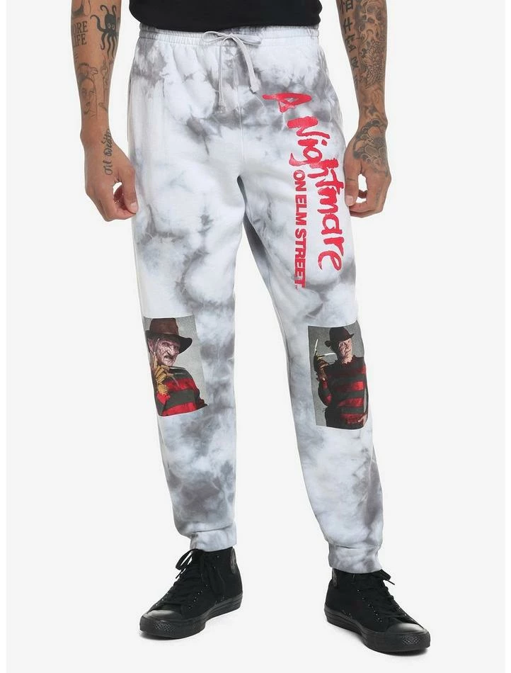 Just because you aren’t getting any sleep tonight, it doesn’t mean you can’t get comfy! These A Nightmare on Elm Street sweatpants have a grey tie-dye pattern and feature the film’s title and images of Freddy Krueger printed down the legs. Comes with hip pockets and an elasticated drawstring waistband.