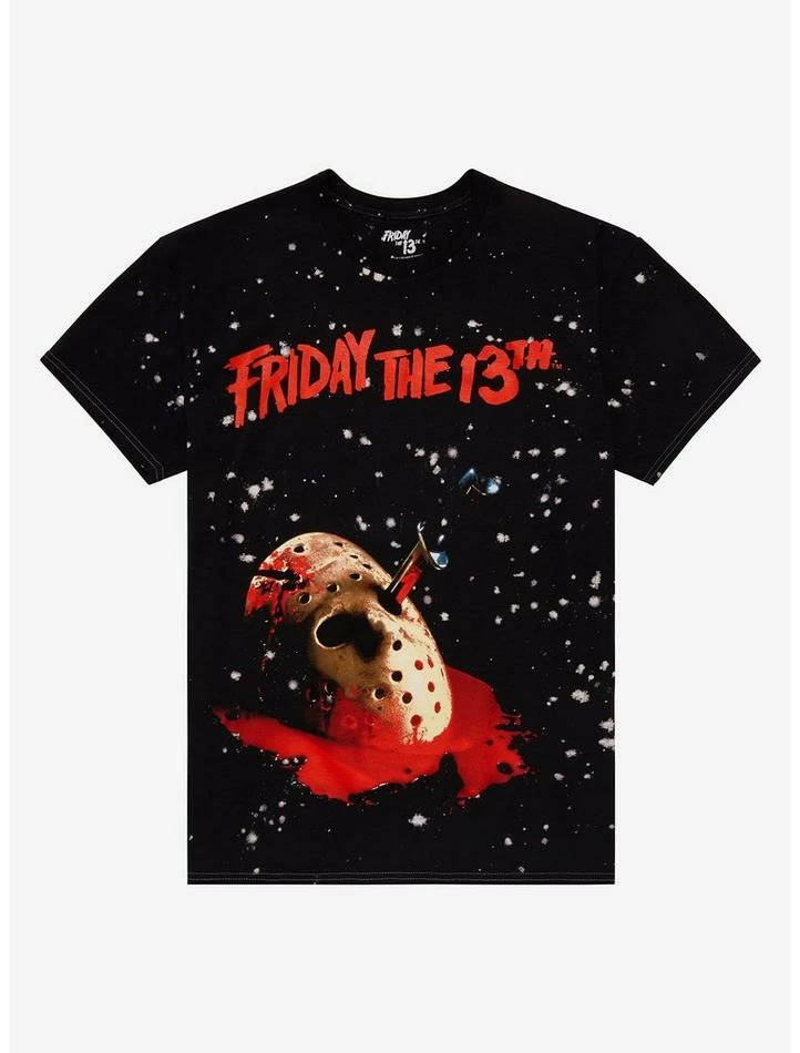 Looking to add something killer to your wardrobe? Add more to your horror collection with this tee from Friday the 13th! Rep Jason with this jumbo print top, featuring the movie title in bloody red font across the top, plus Jason’s mask with a knife stabbed through it, resting on a pool of blood. Comes with a white paint splatter design throughout.