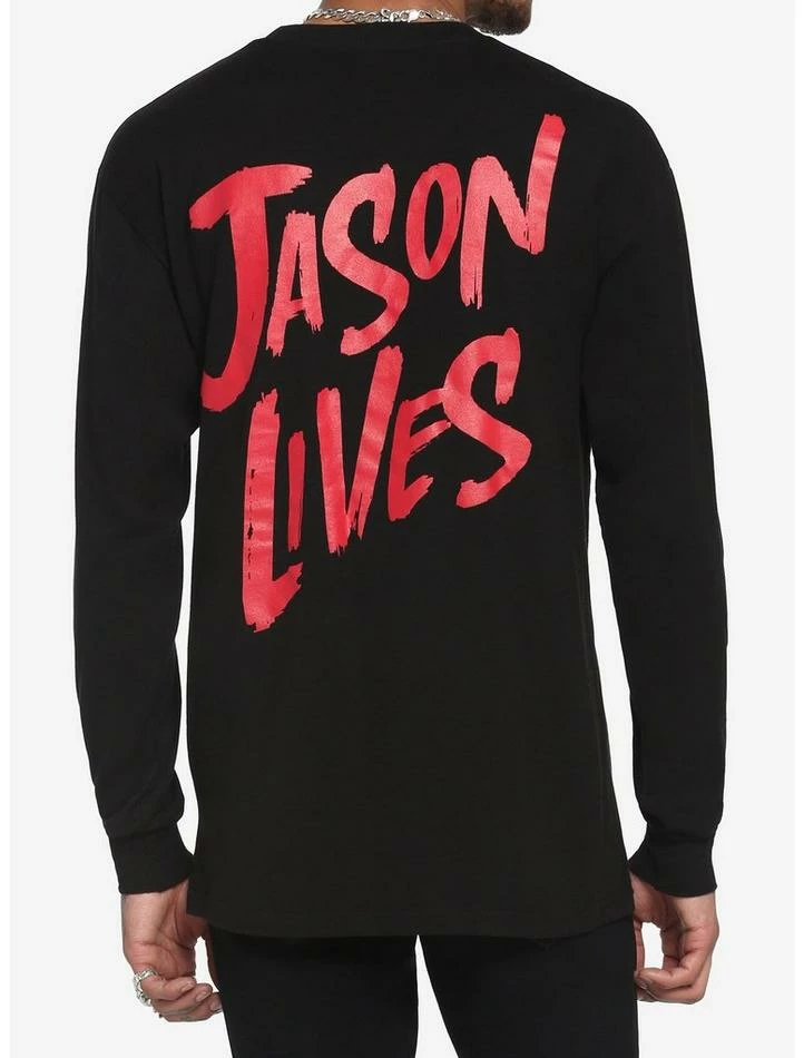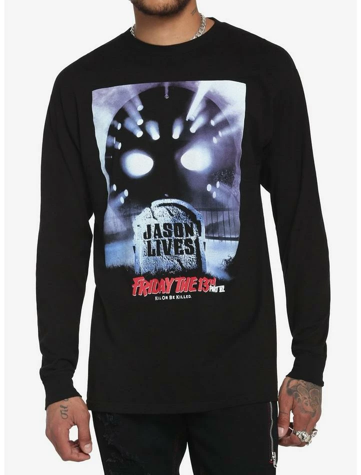 Planning a trip to Camp Crystal Lake? Beware… Jason lives! This black long-sleeve tee features poster art from the film screened on the front.